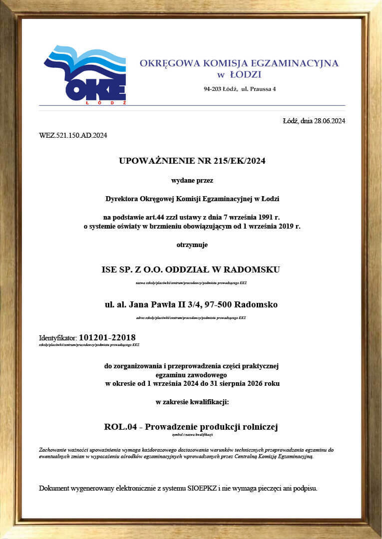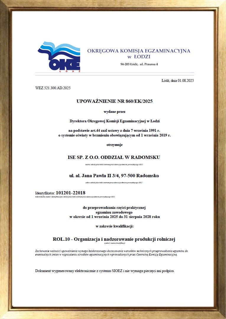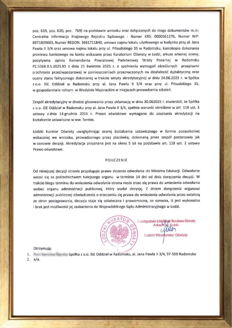 ISE Sp. z o.o. Oddział w Radomsku, jako jedna z niewielu instytucji prowadząca kształcenie w ramach Kwalifikacyjnych Kursów Zawodowych, uzyskała akredytacje Łódzkiego Kuratora Oświaty o numerach: