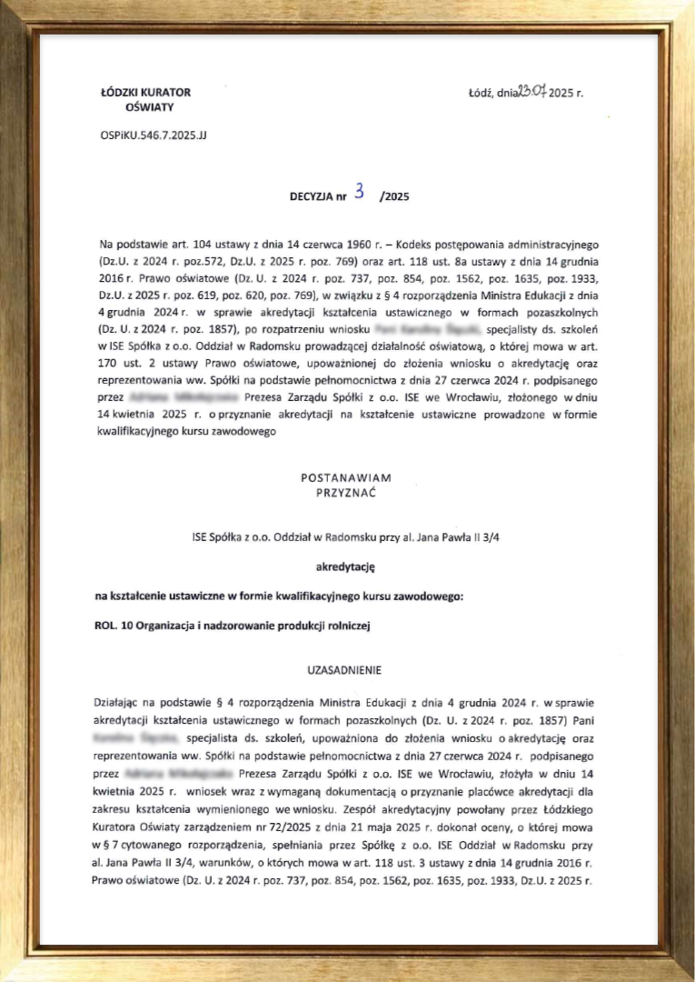 - OSPiKU.546.7.2025.JJ na prowadzenie kursu ROL.10 Organizacja i nadzorowanie produkcji rolniczej.