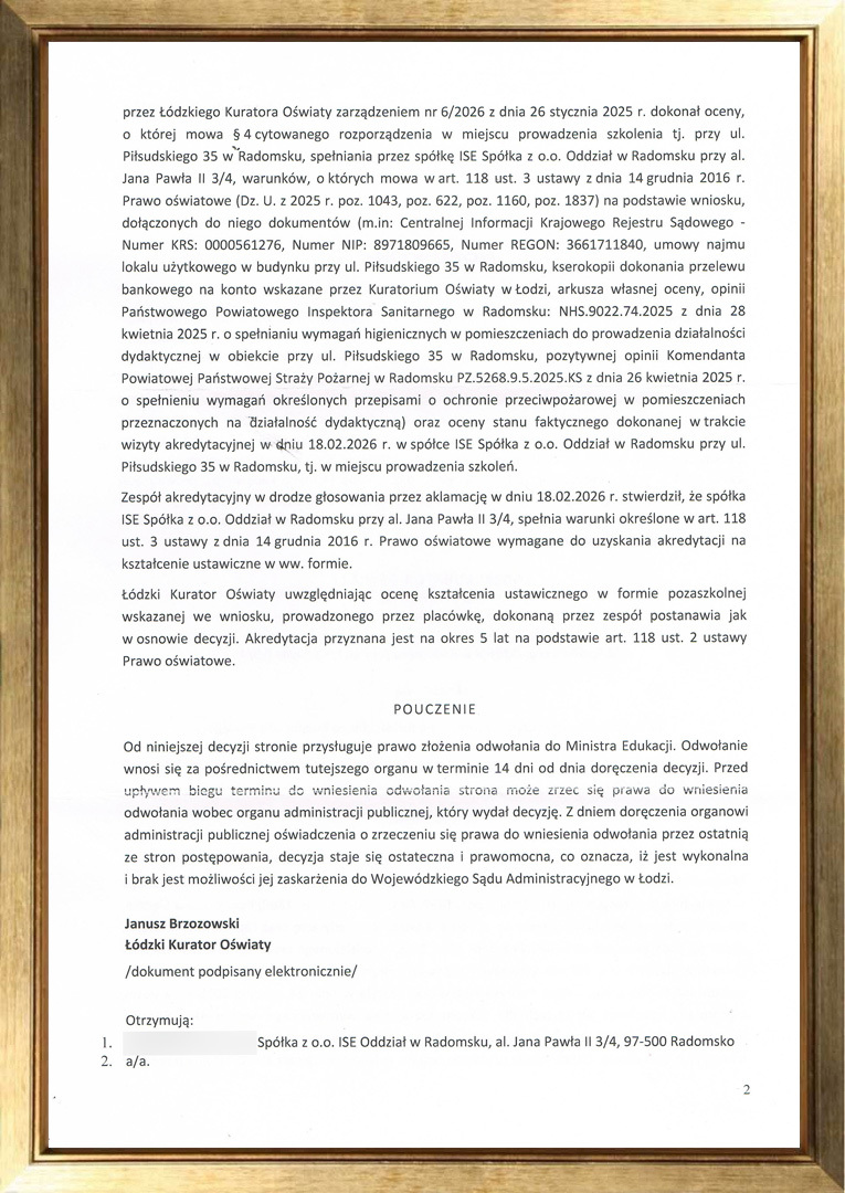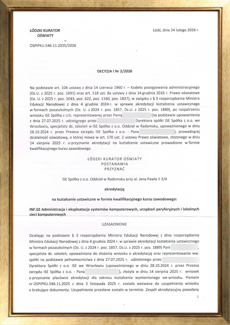 ISE Sp. z o.o. Oddział w Radomsku, jako jedna z niewielu instytucji prowadząca kształcenie w ramach Kwalifikacyjnych Kursów Zawodowych, uzyskała akredytacje Łódzkiego Kuratora Oświaty o numerach: